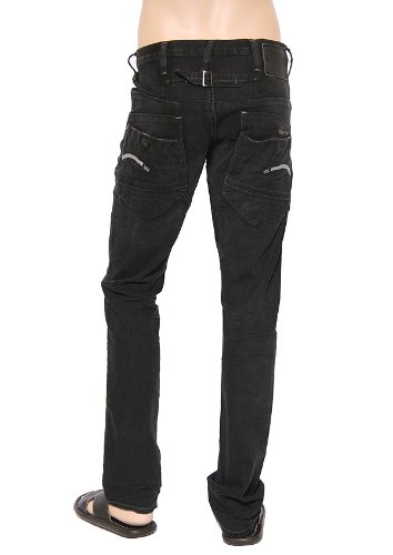 This 5-pocket jean from G-Star Raw features a dark wash denim, whiskering across the hips, subtle distressing down the legs and back, tone on tone stitching, silver and black button and rivet detailing, abrasions, double oversized drop back pockets with button accent and signature stitching, pull tab at the waist and button fly closure.- Style: Blade Slim